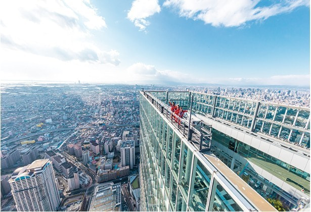 地上 300mのビル最頂端部となる外周ガラスの上部に設置した、幅約 60cm、長さ 20mのデッキの上を、命綱を装着して歩き、スリルを味わうアトラクションです。超高層ビルから真下をのぞくことができるぎりぎりの場所に身一つで立ち、さえぎるものが何もない状態で 360度の絶景と、はるか眼下に広がる街並みを全身で体感いただけます。