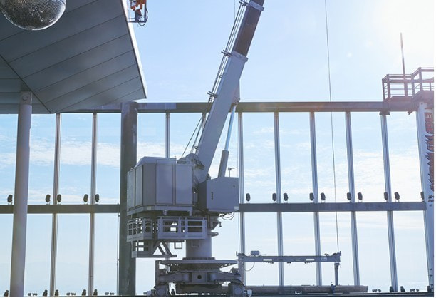 あべのハルカス全体で約 1万 5000枚ある窓ガラスを清掃するために使用する「清掃ゴンドラ」。