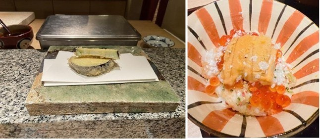 車海老では身と脚を供す順序まで設計し、鮑や白子は雲丹入りの酢飯と合わせることも。