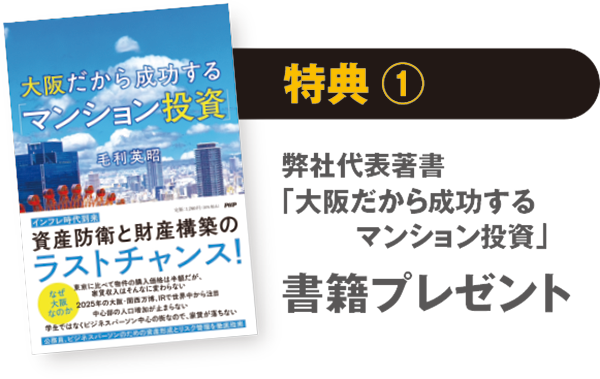 ご参加いただいた方には特典として、弊社代表・毛利英昭の著書『大阪だから成功する「マンション投資」』 をプレゼントいたします。